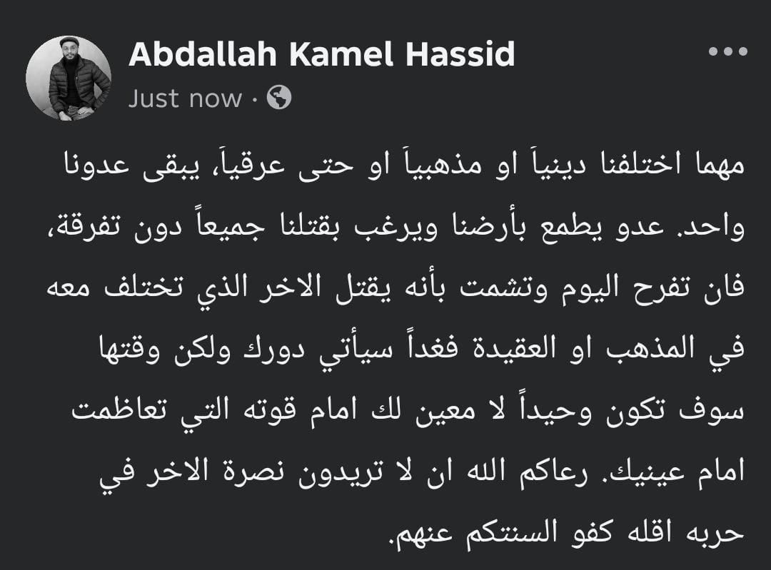 من احدى كتابتي على صفحتي الخاصة لبعض عديمي الإنسانية لانها حرب على الجميع وليس على فريق بعينه