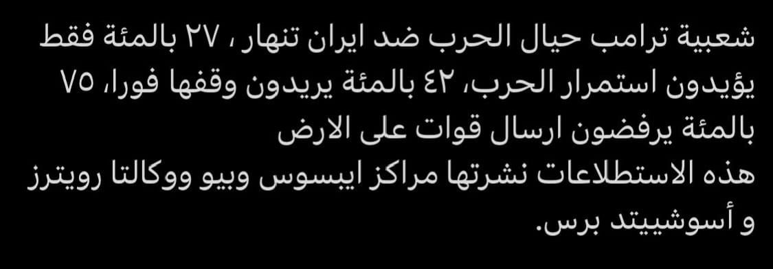 هذا الاستطلاع نشره مركزا ” ايبسوس “ و”بيو”، ووكالتا “رويتر” واسوشايتدبرس” وقد ورد فيه ان 27%من الاميركيين يؤيدون استمرار الحرب على ايران...