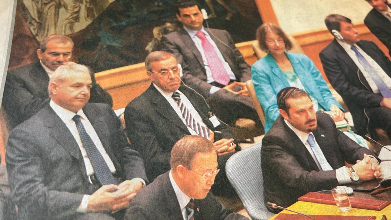 الرئيس سعد الحريري رئيسا لوفد لبنان في الامم المتحدة والى يمينه أمينها العام كيم اين مون وفي اعلى الصورة خلف الحريري بمقعدين الرئيس نواف سلام “وتلك الايام نداولها بين الناس “صدق الله العظيم